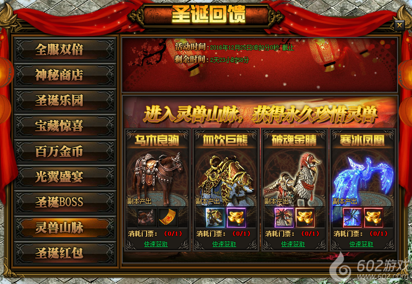 活动详情:活动期间进入灵兽山脉,获得永久珍惜灵兽,快快行动吧~