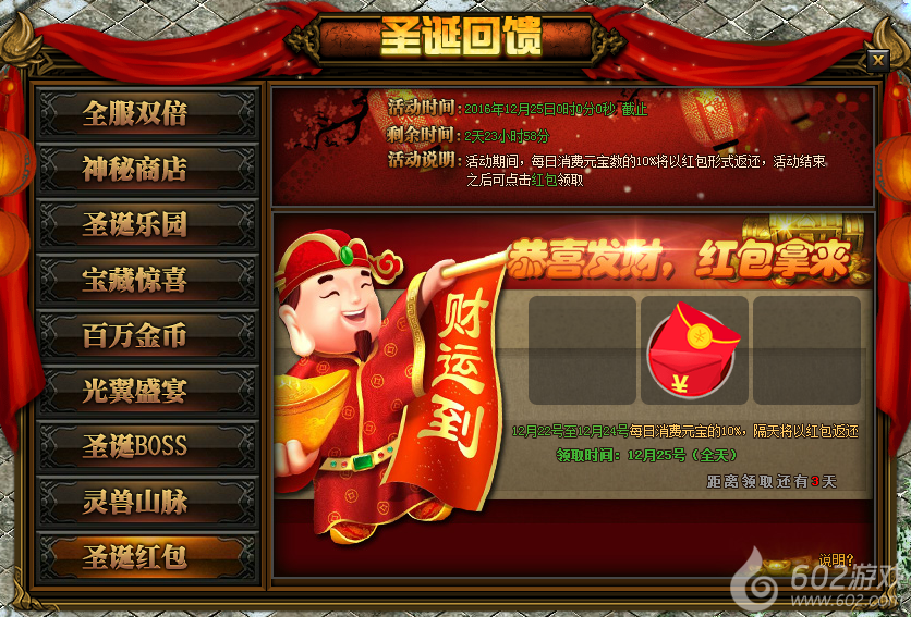 活动详情:活动期间每日消耗元宝数的10%将以红包形式返还,活动结束后可点击红包领取(提示:每日消耗需满1000元宝,若领取日红包没有领取,则以邮件形式发放)