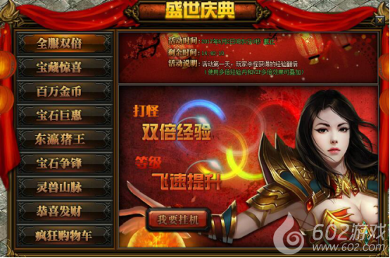 活动详情:活动期间玩家打怪挂机可获得双倍经验加成,此效果与VIP加成及经验卷轴不冲突,让您等级飞速提升。