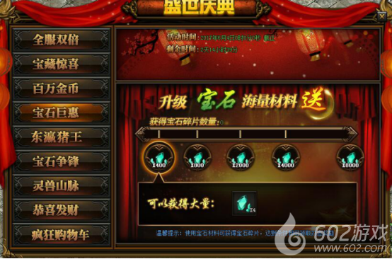 活动详情:活动期间升级宝石海量材料送不停,心动不如行动。(温馨提示:使用宝石材料可获得宝石碎片,达到条件即可领取对应奖励)