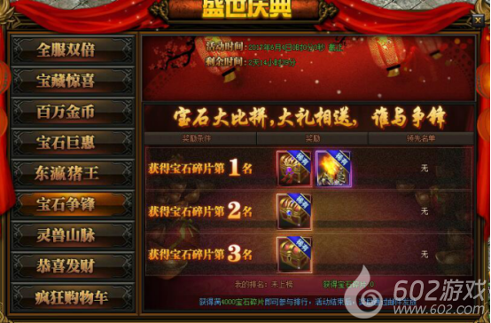 活动详情:活动期间宝石大比拼,大礼相送,谁与争锋;满4000宝石碎片即可参与排名,活动结束后,奖励通过邮件发放。
