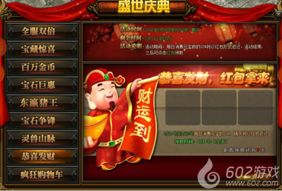 活动详情:活动期间每日消耗元宝数的10%将以红包形式返还,活动结束后可点击红包领取(提示:每日消耗需满1000元宝,若领取日红包没有领取,则以邮件形式发放)