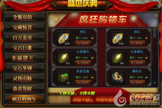 活动详情:活动期间,在活动商城界面,可以把想要购买的道具加入购物车,购物车道具越多,结算时折扣越低;1件9折,2件8折,3件7折,4件6折;每人每天可以通过活动结算购买5次。