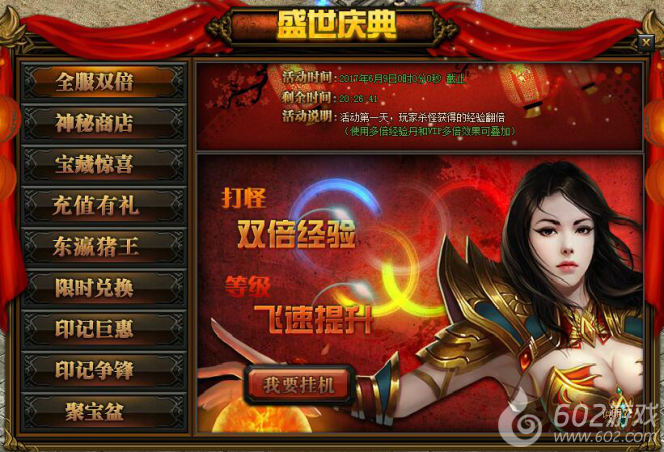 活动详情:活动期间玩家打怪挂机可获得双倍经验加成,此效果与VIP加成及经验卷轴不冲突,让您等级飞速提升。
