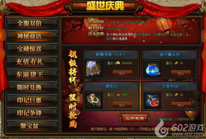 活动详情:活动期间神秘商店内会推出极品道具并以超低的价格供玩家购买,本次新增6级准确石、6级暴击石、极品坐骑、金刚石等珍惜道具,玩家可直接消耗元宝、金币、礼金进行购买,每样道具只能购买一次,当一页的物品购买完后,系统会自动免费刷新一次,您也可以消耗399元宝进行刷新