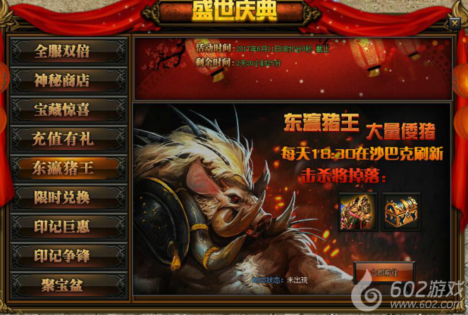 活动详情:活动期间每日18:30沙巴克会刷出猪王,攻击猪王可以获得海量奖励,更有神秘坐骑和神秘宝箱,小伙伴们不要错过哦~