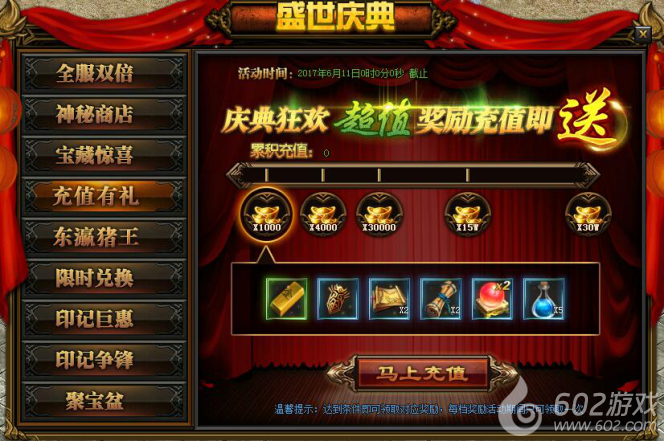 活动详情:活动期间庆典狂欢超值奖励充值即送,达到条件即可领取对应奖励,每档奖励活动期间只可领取一次