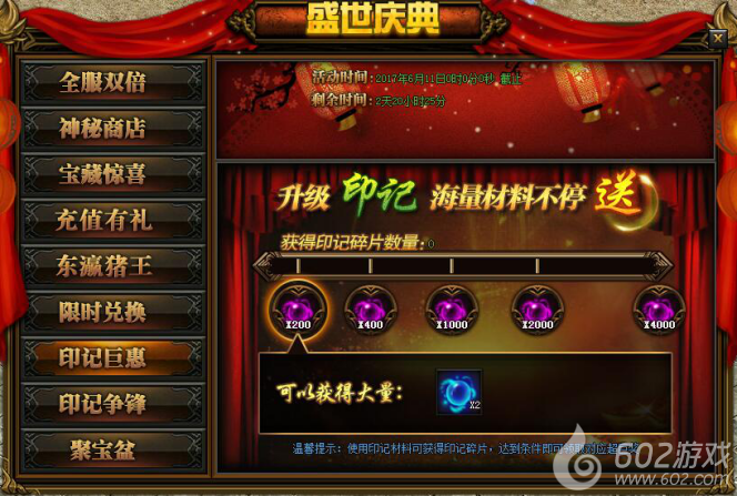 活动详情:活动期间升级印记海量材料送不停,心动不如行动。(温馨提示:使用印记材料可获得印记碎片,达到条件即可领取对应奖励)