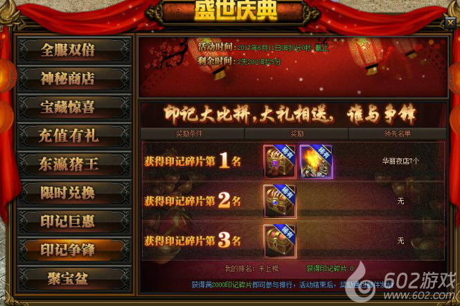 活动详情:活动期间印记大比拼,大礼相送,谁与争锋;满2000印记碎片即可参与排名,活动结束后,奖励通过邮件发放。