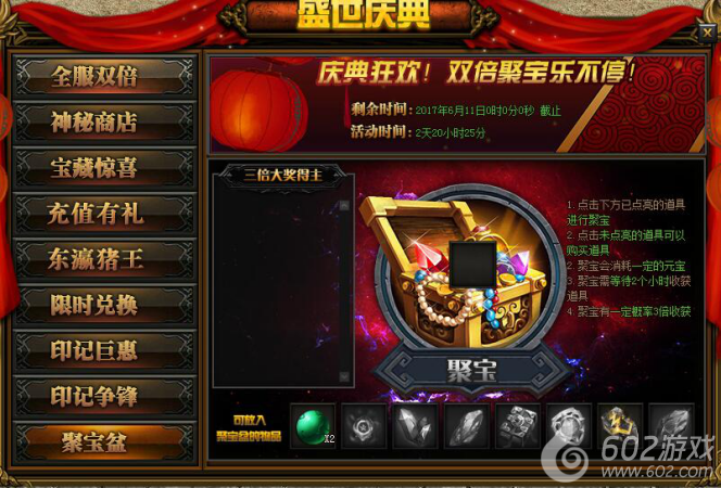 活动详情:活动期间点击未点亮的道具可以购买道具,点击已点亮的道具进行聚宝,聚宝需等待2小时收获道具,聚宝有一定概率3倍收获