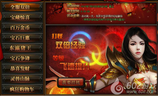 活动详情:活动期间玩家打怪挂机可获得双倍经验加成,此效果与VIP加成及经验卷轴不冲突,让您等级飞速提升。