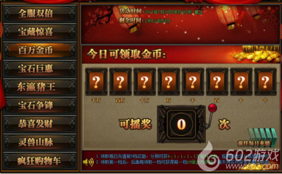 活动详情:活动期间领取每日充值5档奖励,分别可获得4、1、1、1、1次摇杆次数,摇杆的字数会从低到高显示,每日充值的档次后面一档都会高出前面10倍金币收益,如果一天5档的领完就可获得当天金币的最大收益,获得的金币将在每日0点通过邮件的方式发送给玩家