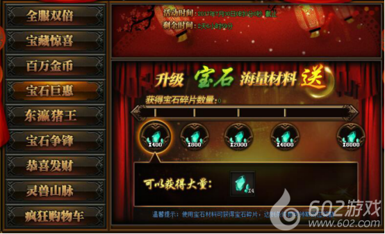 活动详情:活动期间升级宝石海量材料送不停,心动不如行动。(温馨提示:使用宝石材料可获得宝石碎片,达到条件即可领取对应奖励)