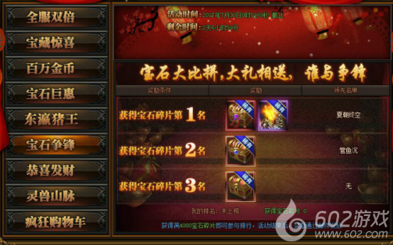 活动详情:活动期间宝石大比拼,大礼相送,谁与争锋;满4000宝石碎片即可参与排名,活动结束后,奖励通过邮件发放。