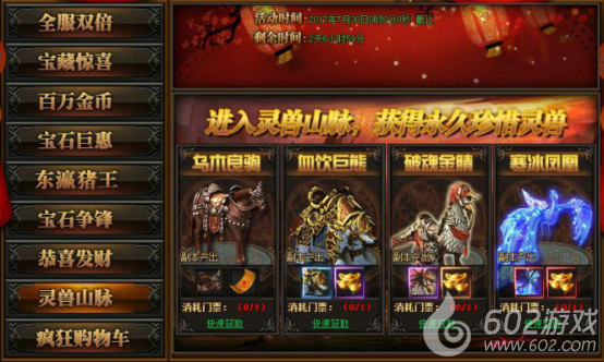 活动详情:活动期间进入灵兽山脉,获得永久珍惜灵兽,快快行动吧~