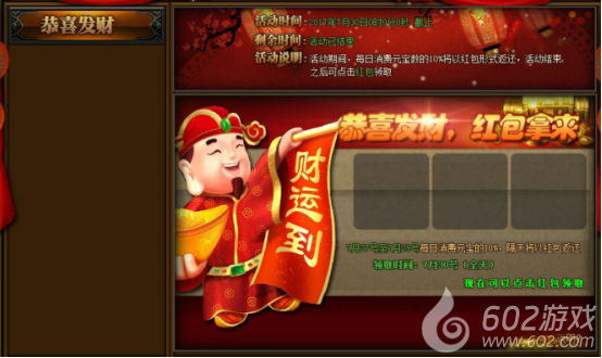 活动详情:活动期间每日消耗元宝数的10%将以红包形式返还,活动结束后可点击红包领取(提示:每日消耗需满1000元宝,若领取日红包没有领取,则以邮件形式发放)