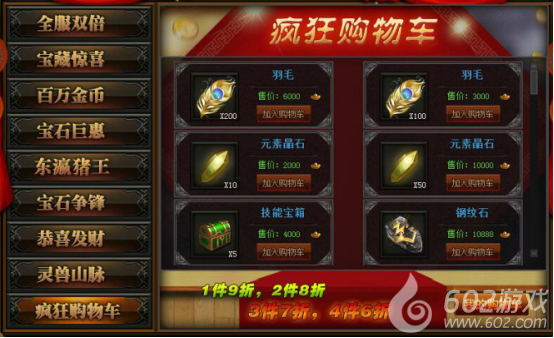 活动详情:活动期间,在活动商城界面,可以把想要购买的道具加入购物车,购物车道具越多,结算时折扣越低;1件9折,2件8折,3件7折,4件6折;每人每天可以通过活动结算购买5次。