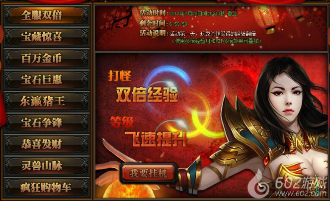 活动详情:活动期间玩家打怪挂机可获得双倍经验加成,此效果与VIP加成及经验卷轴不冲突,让您等级飞速提升。