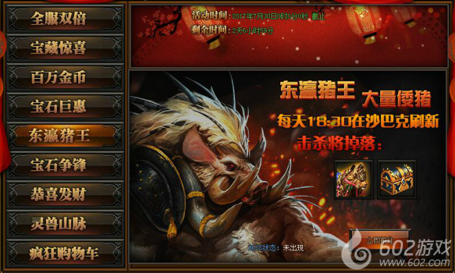 活动详情:活动期间每日18:30沙巴克会刷出猪王,攻击猪王可以获得海量奖励,更有神秘坐骑和神秘宝箱,小伙伴们不要错过哦~