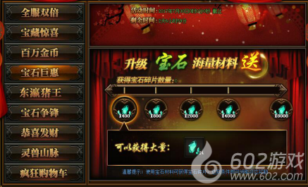 活动详情:活动期间升级宝石海量材料送不停,心动不如行动。(温馨提示:使用宝石材料可获得宝石碎片,达到条件即可领取对应奖励)