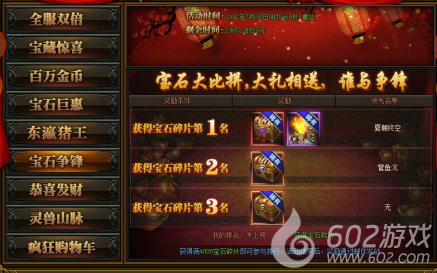 活动详情:活动期间宝石大比拼,大礼相送,谁与争锋;满4000宝石碎片即可参与排名,活动结束后,奖励通过邮件发放。