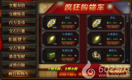 活动详情:活动期间,在活动商城界面,可以把想要购买的道具加入购物车,购物车道具越多,结算时折扣越低;1件9折,2件8折,3件7折,4件6折;每人每天可以通过活动结算购买5次。
