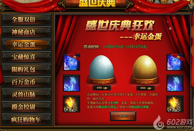 活动详情:活动期间新手村会出现8个金蛋和8个银蛋,手快有、手慢无,全部砸完后需等待5分钟刷新,金蛋出现极品道具的几率高,更有机会开出盛世神龙、寒冰凤凰、狱火麒麟坐骑时装