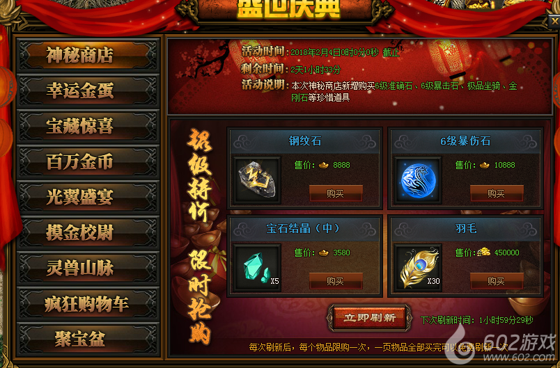活动详情:活动期间神秘商店内会推出极品道具并以超低的价格供玩家购买,本次新增6级准确石、6级暴击石、极品坐骑、金刚石等珍惜道具,玩家可直接消耗元宝、金币、礼金进行购买,每样道具只能购买一次,当一页的物品购买完后,系统会自动免费刷新一次,您也可以消耗399元宝进行刷新