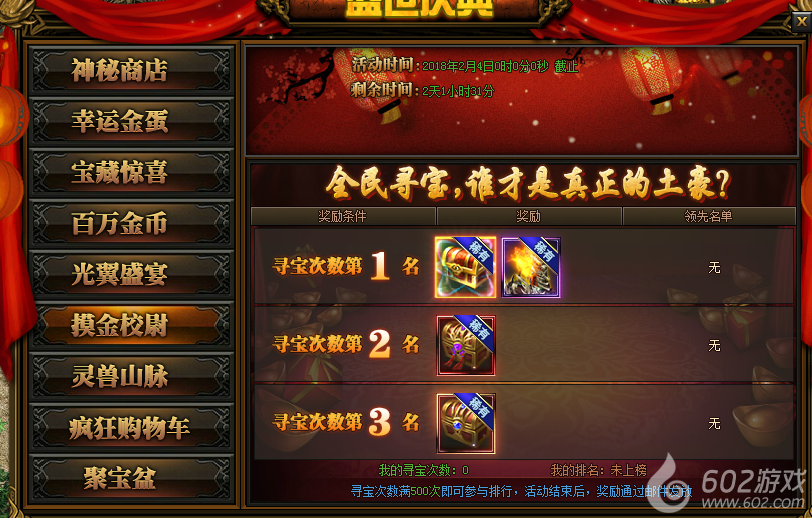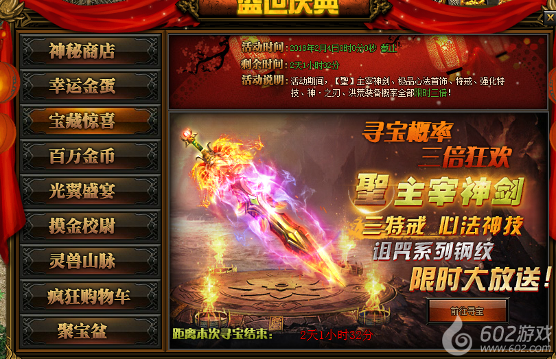 活动详情:活动期间寻宝次数满500次可参与排名,第一名更有主宰神剑等着你,全民寻宝,谁才是真正的土豪?