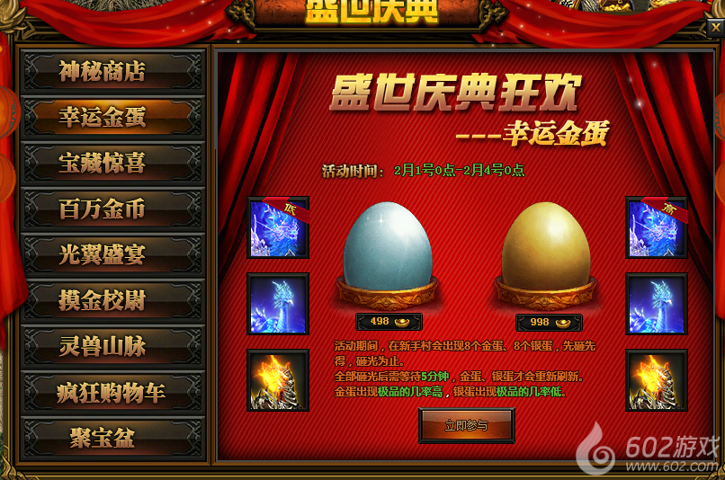 活动详情:活动期间新手村会出现8个金蛋和8个银蛋,手快有、手慢无,全部砸完后需等待5分钟刷新,金蛋出现极品道具的几率高,更有机会开出盛世神龙、寒冰凤凰、狱火麒麟坐骑时装