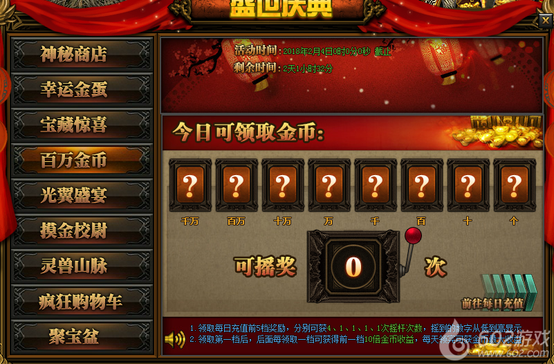 活动详情:活动期间领取每日充值5档奖励,分别可获得4、1、1、1、1次摇杆次数,摇杆的字数会从低到高显示,每日充值的档次后面一档都会高出前面10倍金币收益,如果一天5档的领完就可获得当天金币的最大收益,获得的金币将在每日0点通过邮件的方式发送给玩家