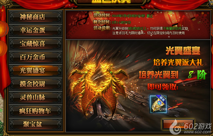 活动详情:活动期间培养光翼返大礼,光翼升级到5阶或5阶以上,均可获得不等量的羽毛奖励(注:羽毛为限时道具,请在时限内及时使用)