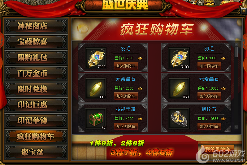 活动详情:活动期间,在活动商城界面,可以把想要购买的道具加入购物车,购物车道具越多,结算时折扣越低;1件9折,2件8折,3件7折,4件6折;每人每天可以通过活动结算购买5次。